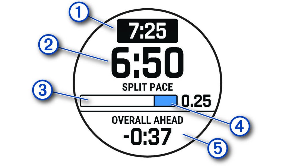 I’ve found the Garmin PacePro system very helpful on many runs. A run is divided into a number of segments, and the watch displays the (1) target pace for that segment, (2) the current pace achieved, (3) and (4) an indication of how much of the segment has been run, and of particular value (5) across the run as a whole, by how much I am ahead or behind target**.