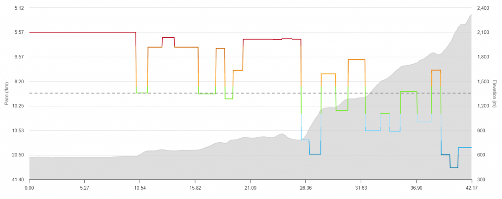 In the end I went back to the source. The .GPX file I’d used for the route, from the Jungfrau Marathon’s own website, had nearly 9000 trackpoints, which is rather a lot, even for a twisty route. I simplified the .GPX file to 2000 points, imported it afresh into Garmin Connect, created an initial PacePro strategy based on elevation changes, and lo and behold! it now was 42.17km long, split into 27 segments totalling 42.14km, effectively the same, with the segment splits being at sensible positions reflecting the topology of the route – save for the false hill in the valley bottom.