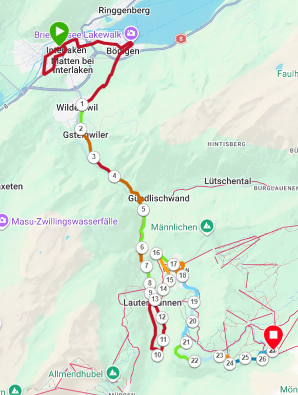 This produces 27 segments, and v1 of my PacePro plan has paces from 5:57/km for the flat 10.19km to Wilderswil, down to 28:12/km for a very steep 790m segment near the top. The Wall from Lauterbrunnen is now two segments at 15:57 and 20:32/km, to produce a 6:28:47 overall finish time.